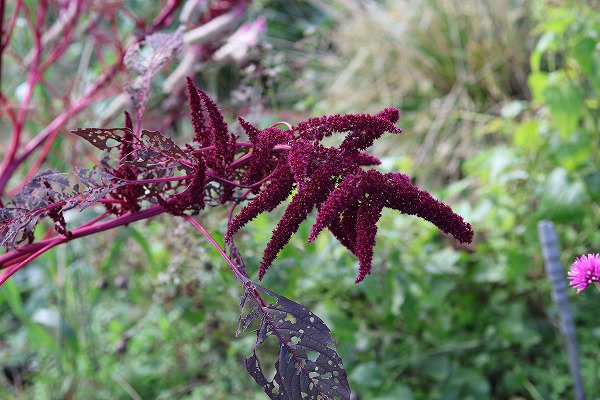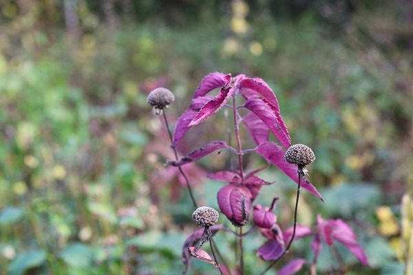 モナルダの葉も美しく染まりだしました。 茎も実も真っ黒に変色したした植物、何だと思いますか?