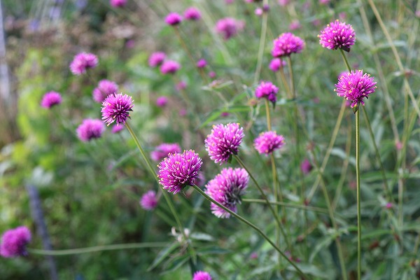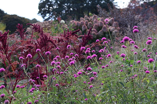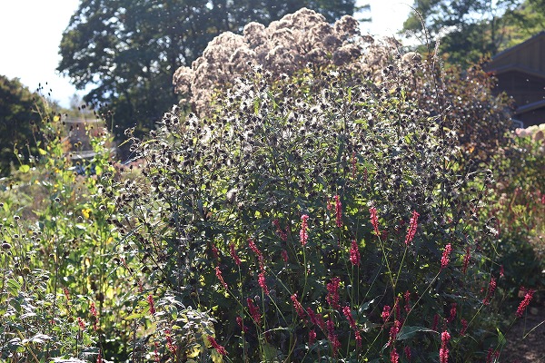 足元に青色フジバカマの綿毛が広がり、その中から真っ黒なシードヘッドが立ち上がる秋ならでは風景。