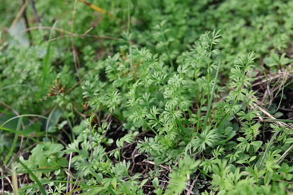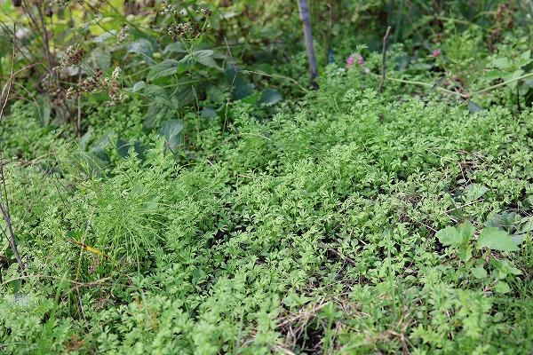 地面からはこぼれ種から発芽したニゲラの芽がたくさん おおきくなあれ。