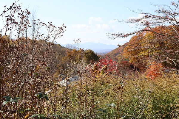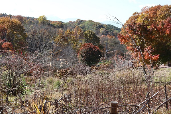 山の紅葉を背景に褐色に変化する庭園を散策できます。